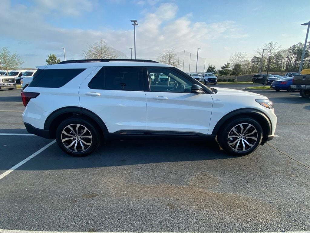 Equipment Group 300A Standard Package (Heated Unique Cloth Captain's Chairs, Radio: B&O Sound System by Bang and Olufsen, and Wheels: 20 Ebony-Painted Machined Aluminum), Explorer ST-Line, 4D Sport Utility, 10-Speed Automatic, White Metallic, Onyx Cloth, 10 Speakers, 3rd row seats: bench, AM/FM radio: SiriusXM with 360L, Apple CarPlay/Android Auto, Auto High-beam Headlights, Automatic temperature control, Electronic Stability Control, Exterior Parking Camera Rear, Front Center Armrest, Front dual zone A/C, Front fog lights, Heated door mirrors, Heated front seats, Heated steering wheel, Navigation System, Overhead console, Power Liftgate, Rear air conditioning, Remote keyless entry, Security system, Spoiler, Steering wheel mounted audio controls, 4-Wheel Disc Brakes, ABS brakes, Air Conditioning, Alloy wheels, Brake assist, Bumpers: body-color, Compass, Delay-off headlights, Driver door bin, Driver vanity mirror, Dual front impact airbags, Dual front side impact airbags, Emergency communication system: 911 Assist, Four wheel independent suspension, Front anti-roll bar, Front Bucket Seats, Front License Plate Bracket, Front reading lights, Fully automatic headlights, Garage door transmitter, Illuminated entry, Knee airbag, Leather steering wheel, Low tire pressure warning, Occupant sensing airbag, Outside temperature display, Overhead airbag, Panic alarm, Passenger door bin, Passenger vanity mirror, Power door mirrors, Power driver seat, Power passenger seat, Power steering, Power windows, Rear anti-roll bar, Rear reading lights, Rear window defroster, Rear window wiper, Speed control, Speed-sensing steering, Speed-Sensitive Wipers, Split folding rear seat, Tachometer, Telescoping steering wheel, Tilt steering wheel, Traction control, Trip computer, and Variably intermittent wipers.