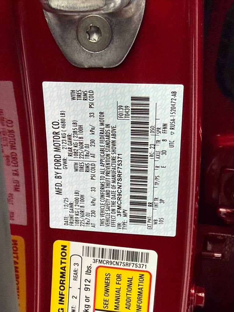 Equipment Group 300A, Bronco Sport Outer Banks, 4D Sport Utility, 4WD, Ruby Red Metallic, Ebony/Roast Cloth, 4-Wheel Disc Brakes, 6 Speakers, AM/FM Stereo, Automatic temperature control, Brake assist, Electronic Stability Control, Four wheel independent suspension, Front Driver/Passenger Seat Back Map Pockets, Front dual zone A/C, Front fog lights, Fully automatic headlights, Heated door mirrors, Heated front seats, Heated steering wheel, Memory seat, Premium Trimmed Front Bucket Seats w/Ebony/Roast, Rear window defroster, Remote keyless entry, Security system, SiriusXM, Steering wheel mounted audio controls, SYNC 4 w/Enhanced Voice Recognition, Wheels: 18 Ebony Black-Painted Aluminum, ABS brakes, Air Conditioning, Alloy wheels, Auto-dimming Rear-View mirror, Compass, Delay-off headlights, Driver door bin, Driver vanity mirror, Dual front impact airbags, Dual front side impact airbags, Emergency communication system: SYNC 4 911 Assist, Front anti-roll bar, Front Center Armrest, Front License Plate Bracket, Front reading lights, Garage door transmitter, Illuminated entry, Knee airbag, Low tire pressure warning, Occupant sensing airbag, Outside temperature display, Overhead airbag, Overhead console, Panic alarm, Passenger door bin, Passenger vanity mirror, Power door mirrors, Power driver seat, Power passenger seat, Power steering, Power windows, Radio data system, Rain sensing wipers, Rear anti-roll bar, Rear reading lights, Rear seat center armrest, Rear window wiper, Speed control, Speed-sensing steering, Speed-Sensitive Wipers, Split folding rear seat, Tachometer, Telescoping steering wheel, Tilt steering wheel, Traction control, Trip computer, and Variably intermittent wipers.