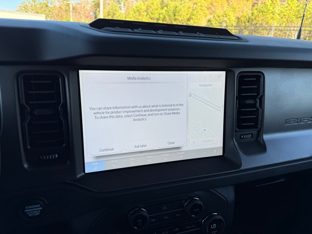 Equipment Group 332A Mid Package (2-Door Intelligent Access w/Lock/Unlock, Ambient Footwell Lighting, Connected Navigation, Dual-Zone Electronic Automatic Temperature Control, Power Outlet - Back Side of Center Floor Console, Dr & Pass Illuminated Sliding Visor Vanity Mirrors, and Dual Smart Charging USB Ports), Bronco Badlands, 4D Sport Utility, 4WD, Azure Gray Metallic, Black Onyx, AM/FM Stereo, BLIS Blind Spot Information System, Body Color-Painted Hard Top, Brake assist, Electronic Stability Control, Front fog lights, Fully automatic headlights, Hard Top Sound Deadening Headliner, Heated steering wheel, Illuminated entry, Lane-Keeping System, Marine Grade Vinyl Heated Bucket Seats, Overhead console, Pre-Collision Assist w/Automatic Emergency Braking, Rear-Window Defroster & Washer, Security system, SiriusXM w/360L, SYNC 4, Wheels: 17 Carbonized Gray-Painted Aluminum, 4-Wheel Disc Brakes, 4.7 Axle Ratio, 7 Speakers, ABS brakes, Air Conditioning, Alloy wheels, Auto High-Beam Headlamps, Auto-dimming Rear-View mirror, Compass, Delay-off headlights, Driver door bin, Driver vanity mirror, Dual front impact airbags, Dual front side impact airbags, Emergency communication system: 911 Assist, Front anti-roll bar, Front Center Armrest, Front License Plate Bracket, Front reading lights, Front wheel independent suspension, Heated door mirrors, Integrated roll-over protection, Leather Shift Knob, Low tire pressure warning, Occupant sensing airbag, Outside temperature display, Overhead airbag, Panic alarm, Passenger door bin, Passenger vanity mirror, Power door mirrors, Power steering, Power windows, Radio data system, Remote keyless entry, Speed control, Split folding rear seat, Steering wheel mounted audio controls, Tachometer, Telescoping steering wheel, Tilt steering wheel, Traction control, Trip computer, Variably intermittent wipers, and Voltmeter.