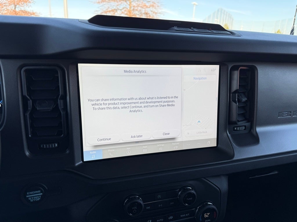 Equipment Group 222A Mid Package (2-Door Intelligent Access w/Lock/Unlock, Ambient Footwell Lighting, Connected Navigation, Dr & Pass Illuminated Sliding Visor Vanity Mirrors, Dual Smart Charging USB Ports, Dual-Zone Electronic Automatic Temperature Control, Front Row Heated Seats, Power Outlet - Back Side of Center Floor Console, and Rear Parking Sensors), Bronco Big Bend, 4D Sport Utility, 4WD, Gray Metallic, 7 Speakers, AM/FM Stereo, Auto High-Beam Headlamps, BLIS Blind Spot Information System, Carbonized Gray Molded-In-Color Hard Top, Front Center Armrest, Hard Top Sound Deadening Headliner, Heated door mirrors, Pre-Collision Assist w/Automatic Emergency Braking, Rear-Window Defroster & Washer, Remote keyless entry, Security system, Side Step, SiriusXM w/360L, SYNC 4, Wheels: 17 Carbonized Gray-Painted Aluminum, 4-Wheel Disc Brakes, 4.46 Axle Ratio, ABS brakes, Air Conditioning, Alloy wheels, Brake assist, Compass, Delay-off headlights, Driver door bin, Driver vanity mirror, Dual front impact airbags, Dual front side impact airbags, Electronic Stability Control, Emergency communication system: 911 Assist, Front anti-roll bar, Front License Plate Bracket, Front reading lights, Front wheel independent suspension, Illuminated entry, Integrated roll-over protection, Internet access capable: FordPass Connect, Leather Shift Knob, Low tire pressure warning, Occupant sensing airbag, Outside temperature display, Overhead airbag, Overhead console, Panic alarm, Passenger door bin, Passenger vanity mirror, Power door mirrors, Power steering, Power windows, Radio data system, Speed control, Split folding rear seat, Steering wheel mounted audio controls, Tachometer, Telescoping steering wheel, Tilt steering wheel, Traction control, Trip computer, and Variably intermittent wipers.