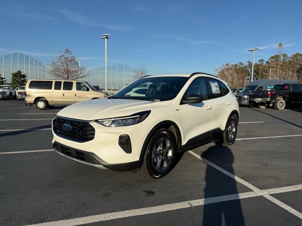 Equipment Group 300A (3.81 Axle Ratio, 4-Way Manual Front Passenger Seat, 8-Way Power Driver Seat, Ford App, Partial Vinyl/Cloth Front Sport Contour Bucket Seats with Red Stitching, Radio: AM/FM Stereo with SiriusXM 360L, and Wheels: 18 Rock Metallic Painted Aluminum), Tech Pack #1 (Adaptive Cruise Control with Stop-and-Go, Connected Navigation (1-Year Included), Digital Rear View Camera, Evasive Steering Assist, Ford Co-Pilot360 Assist+, Intersection Assist, Predictive Speed Assist, Rear Parking Sensor, and SYNC 4 with Enhanced Voice Recognition), Escape ST-Line, 4D Sport Utility, White Metallic, Ebony Vinyl, 4-Wheel Disc Brakes, 6 Speakers, Automatic temperature control, Four wheel independent suspension, Front dual zone A/C, Fully automatic headlights, Heated steering wheel, Illuminated entry, Overhead console, Power door mirrors, Remote keyless entry, Spoiler, Sport steering wheel, Steering wheel mounted audio controls, ABS brakes, Air Conditioning, Alloy wheels, Brake assist, Bumpers: body-color, Compass, Delay-off headlights, Driver door bin, Driver vanity mirror, Dual front impact airbags, Dual front side impact airbags, Electronic Stability Control, Emergency communication system: SYNC 4 911 Assist, Front anti-roll bar, Front Bucket Seats, Front Center Armrest, Front License Plate Bracket, Front reading lights, Knee airbag, Low tire pressure warning, Occupant sensing airbag, Outside temperature display, Overhead airbag, Panic alarm, Passenger door bin, Passenger vanity mirror, Power driver seat, Power steering, Power windows, Radio data system, Rear anti-roll bar, Rear reading lights, Rear seat center armrest, Rear window defroster, Rear window wiper, Speed control, Speed-sensing steering, Speed-Sensitive Wipers, Split folding rear seat, Tachometer, Telescoping steering wheel, Tilt steering wheel, Traction control, Trip computer, and Variably intermittent wipers.