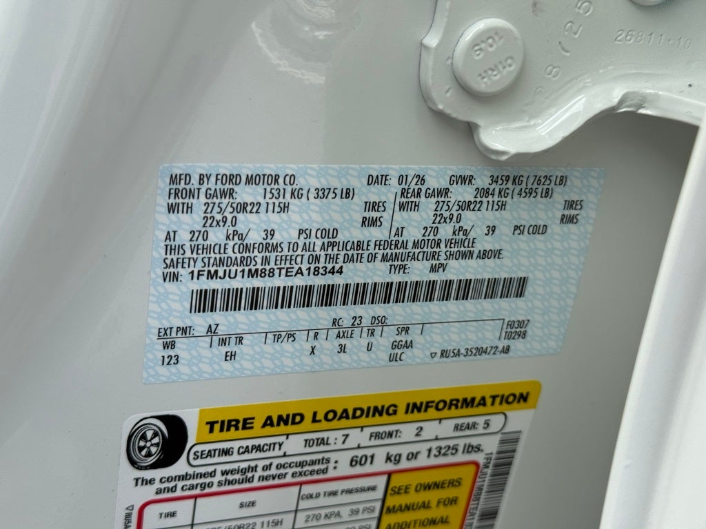Equipment Group 600A Standard Package (2nd Row Power-Folding Captain's Chairs, 3.73 Axle Ratio, BlueCruise Equipped (90-Day Trial), Ford Digital Experience, Heated and Ventilated Leather Front Captain's Chairs, Radio: B&O Sound System by Bang and Olufsen, Wheels: 20 x 8.5 Ebony Bright Machined Aluminum, and Power Tilt/Telescopic Steering Wheel with Memory), Ford Connectivity Package (1-Year Included), Stealth Appearance Package (Black Belt Molding, Black Expedition Lettering on Hood, Black Headlamp Bezel with Ebony Trim Applique, Black Platinum Badge on Tailgate, Black Roof Rails, Carbon Black Front Bumper/Fascia, Rear Side Windows Laminated Glass, and Signature Grille Lighting), Expedition Platinum, 4WD, White Metallic, Black Onyx Leather, 10 Speakers, AM/FM radio: SiriusXM with 360L, Apple CarPlay/Android Auto, Auto High-beam Headlights, Automatic temperature control, Front Center Armrest, Front dual zone A/C, Heated door mirrors, Heated rear seats, Heated steering wheel, Illuminated entry, Intersection Assist, Memory seat, Navigation System, Power moonroof: Vista Roof, Rear air conditioning, Reclining 3rd row seat, Security system, Spoiler, 3rd row seats: split-bench, 4-Wheel Disc Brakes, ABS brakes, Air Conditioning, Alloy wheels, Auto-dimming door mirrors, Auto-dimming Rear-View mirror, Brake assist, Bumpers: body-color, Compass, Delay-off headlights, Driver door bin, Driver vanity mirror, Dual front impact airbags, Dual front side impact airbags, Electronic Stability Control, Emergency communication system: 911 Assist, Four wheel independent suspension, Front anti-roll bar, Front License Plate Bracket, Front reading lights, Garage door transmitter, Genuine wood dashboard insert, Genuine wood door panel insert, Leather steering wheel, Low tire pressure warning, Occupant sensing airbag, Outside temperature display, Overhead airbag, Overhead console, Panic alarm, Passenger door bin, Passenger vanity mirror, Power door mirrors, Power driver seat, Power passenger seat, Power steering, Power windows, Radio data system, Rain sensing wipers, Rear anti-roll bar, Rear reading lights, Rear window defroster, Rear window wiper, Remote keyless entry, Speed control, Speed-sensing steering, Speed-Sensitive Wipers, Split folding rear seat, Steering wheel memory, Steering wheel mounted audio controls, Tachometer, Telescoping steering wheel, Tilt steering wheel, Traction control, Trip computer, Turn signal indicator mirrors, Variably intermittent wipers, and Voltmeter.