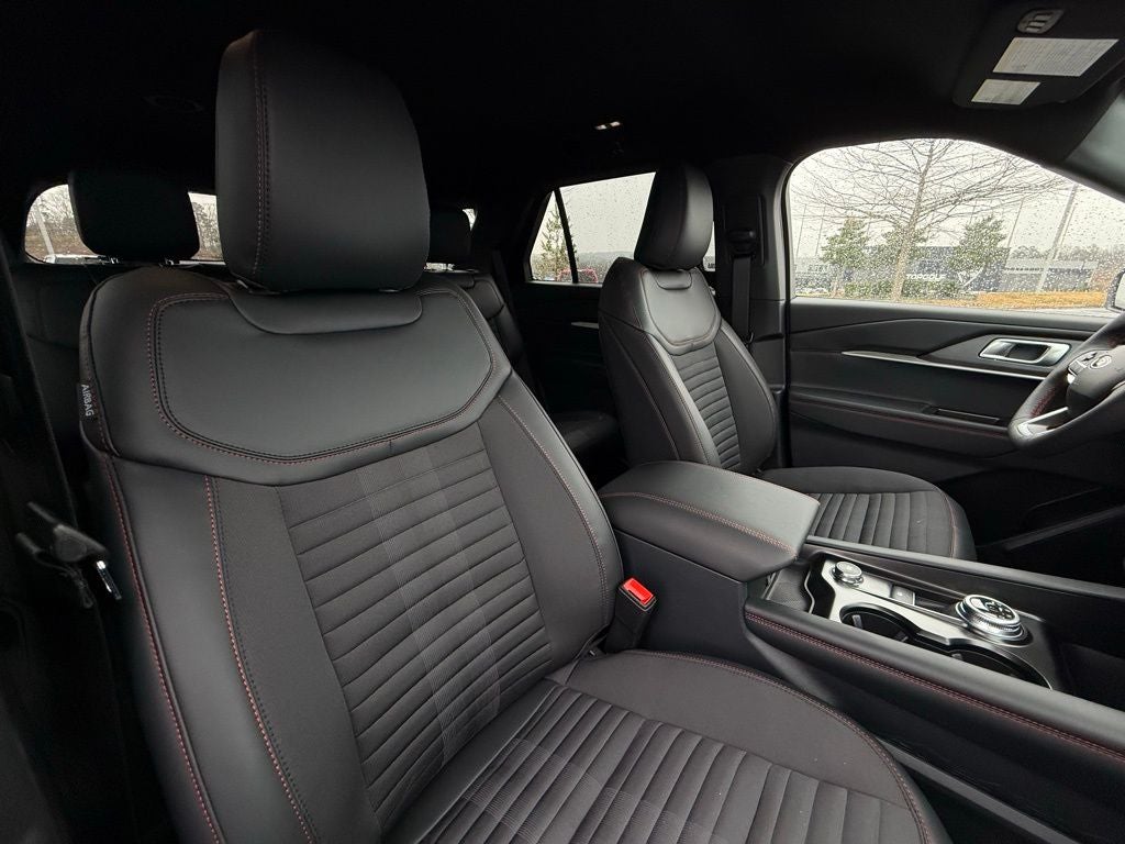 Equipment Group 300A Standard Package (Heated Unique Cloth Captain's Chairs, Radio: B&O Sound System by Bang and Olufsen, and Wheels: 20 Ebony-Painted Machined Aluminum), Explorer ST-Line, 4D Sport Utility, 4WD, Onyx Cloth, 10 Speakers, 2nd Row Captain's Chairs w/E-Z Entry and Armrest, 3rd row seats: bench, 4-Wheel Disc Brakes, AM/FM radio: SiriusXM with 360L, Apple CarPlay/Android Auto, BlueCruise (equipment + 1-Year + 90-Day Plan), BlueCruise Hardware, Brake assist, Electronic Stability Control, Four wheel independent suspension, Front dual zone A/C, Front fog lights, Fully automatic headlights, Heated door mirrors, Heated steering wheel, Navigation System, Power Liftgate, Rear air conditioning, Remote keyless entry, Security system, Spoiler, ABS brakes, Air Conditioning, Alloy wheels, Automatic temperature control, Bumpers: body-color, Compass, Delay-off headlights, Driver door bin, Driver vanity mirror, Dual front impact airbags, Dual front side impact airbags, Emergency communication system: 911 Assist, Front anti-roll bar, Front Center Armrest, Front License Plate Bracket, Front reading lights, Garage door transmitter, Illuminated entry, Knee airbag, Leather steering wheel, Low tire pressure warning, Occupant sensing airbag, Outside temperature display, Overhead airbag, Overhead console, Panic alarm, Passenger door bin, Passenger vanity mirror, Power door mirrors, Power driver seat, Power passenger seat, Power steering, Power windows, Rear anti-roll bar, Rear reading lights, Rear window defroster, Rear window wiper, Speed control, Speed-sensing steering, Speed-Sensitive Wipers, Split folding rear seat, Steering wheel mounted audio controls, Tachometer, Telescoping steering wheel, Tilt steering wheel, Traction control, Trip computer, and Variably intermittent wipers.