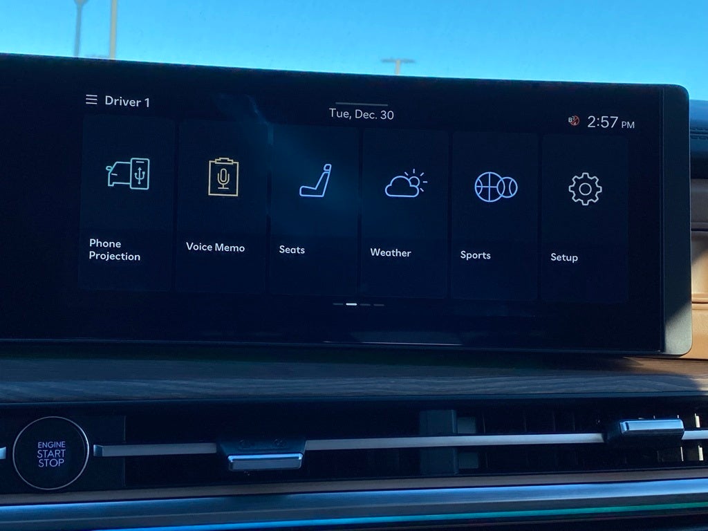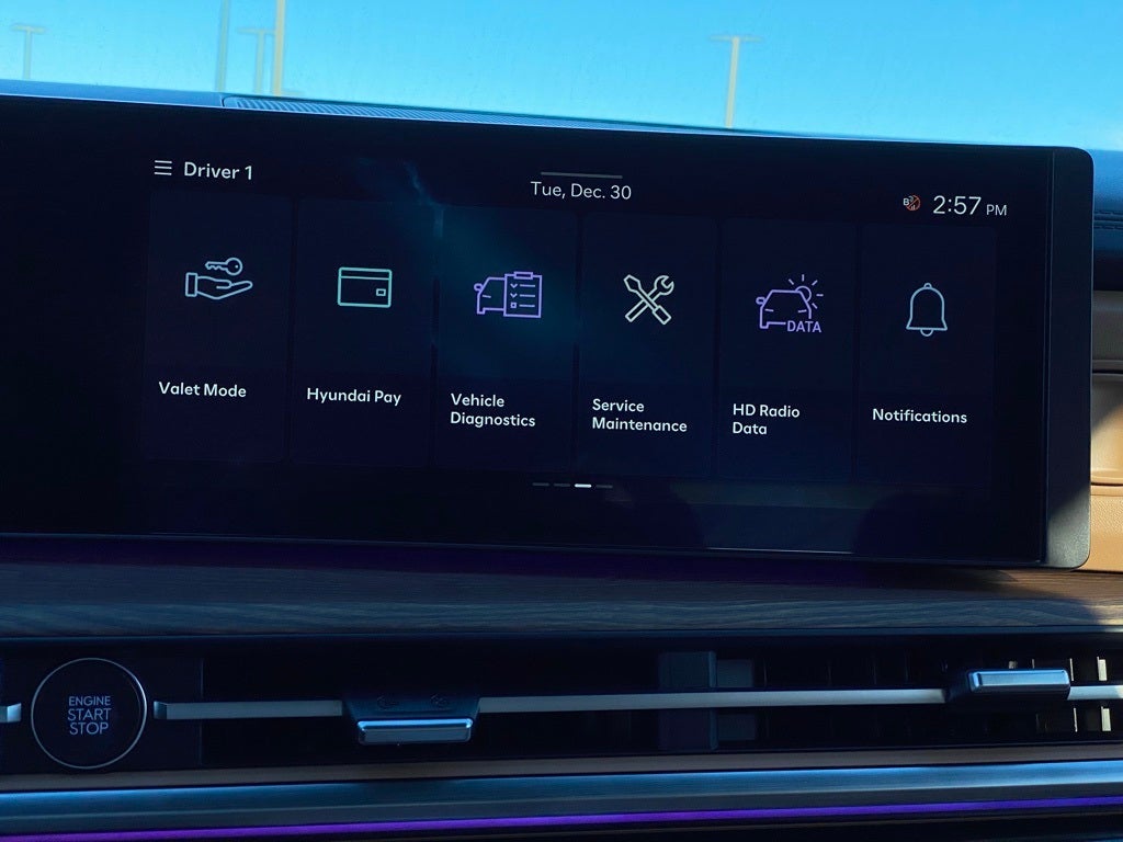 - Radio: AM/FM/HD Bose Premium Audio System -inc: 12 speakers including subwoofer, external amplifier, 12.3" wide touchscreen, Apple CarPlay and Android Auto, Bluetooth® hands-free w/wireless audio streaming, dynamic voice recognition, USB connectivity, SiriusXM, Blue Link+ connected car system, over-the-air updating capability, navigation system including traffic flow w/incident data via HD Radio (HERE) and rear seat quiet mode