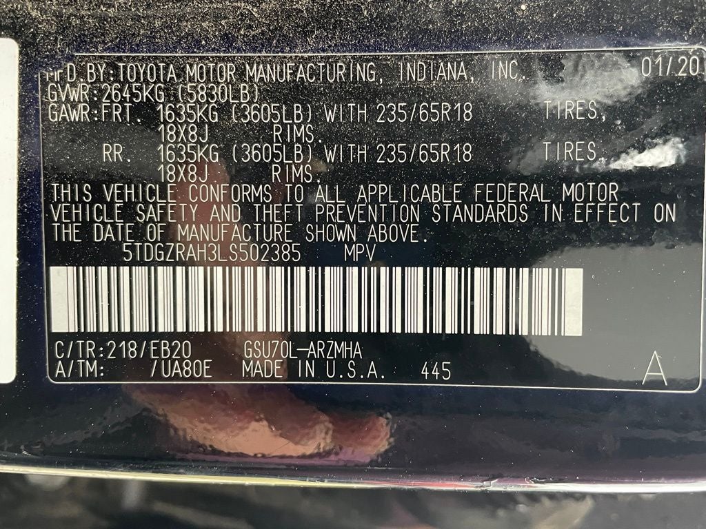 18 Machined Alloy Wheels, 3.003 Axle Ratio, 3rd row seats: split-bench, 4-Wheel Disc Brakes, 6 Speakers, ABS brakes, Air Conditioning, Alloy wheels, AM/FM radio: SiriusXM, Apple CarPlay/Android Auto, Auto High-beam Headlights, Auto-dimming Rear-View mirror, Automatic temperature control, Brake assist, Bumpers: body-color, Delay-off headlights, Driver door bin, Driver vanity mirror, Dual front impact airbags, Dual front side impact airbags, Electronic Stability Control, Emergency communication system: Safety Connect with 3-year trial, Exterior Parking Camera Rear, Four wheel independent suspension, Front anti-roll bar, Front Bucket Seats, Front Center Armrest, Front dual zone A/C, Front fog lights, Front reading lights, Fully automatic headlights, Garage door transmitter: HomeLink, Heated door mirrors, Heated Front Bucket Seats, Heated front seats, Illuminated entry, Knee airbag, Leather Shift Knob, Low tire pressure warning, Occupant sensing airbag, Outside temperature display, Overhead airbag, Overhead console, Panic alarm, Passenger door bin, Passenger vanity mirror, Power door mirrors, Power driver seat, Power Liftgate, Power moonroof, Power passenger seat, Power steering, Power windows, Radio: Audio Plus (T1 Hi), Rear air conditioning, Rear anti-roll bar, Rear reading lights, Rear window defroster, Rear window wiper, Reclining 3rd row seat, Remote keyless entry, Roof rack: rails only, Security system, SofTex Seat Trim, Speed control, Speed-sensing steering, Split folding rear seat, Spoiler, Steering wheel mounted audio controls, Tachometer, Telescoping steering wheel, Tilt steering wheel, Traction control, Trip computer, Turn signal indicator mirrors, Variably intermittent wipers.